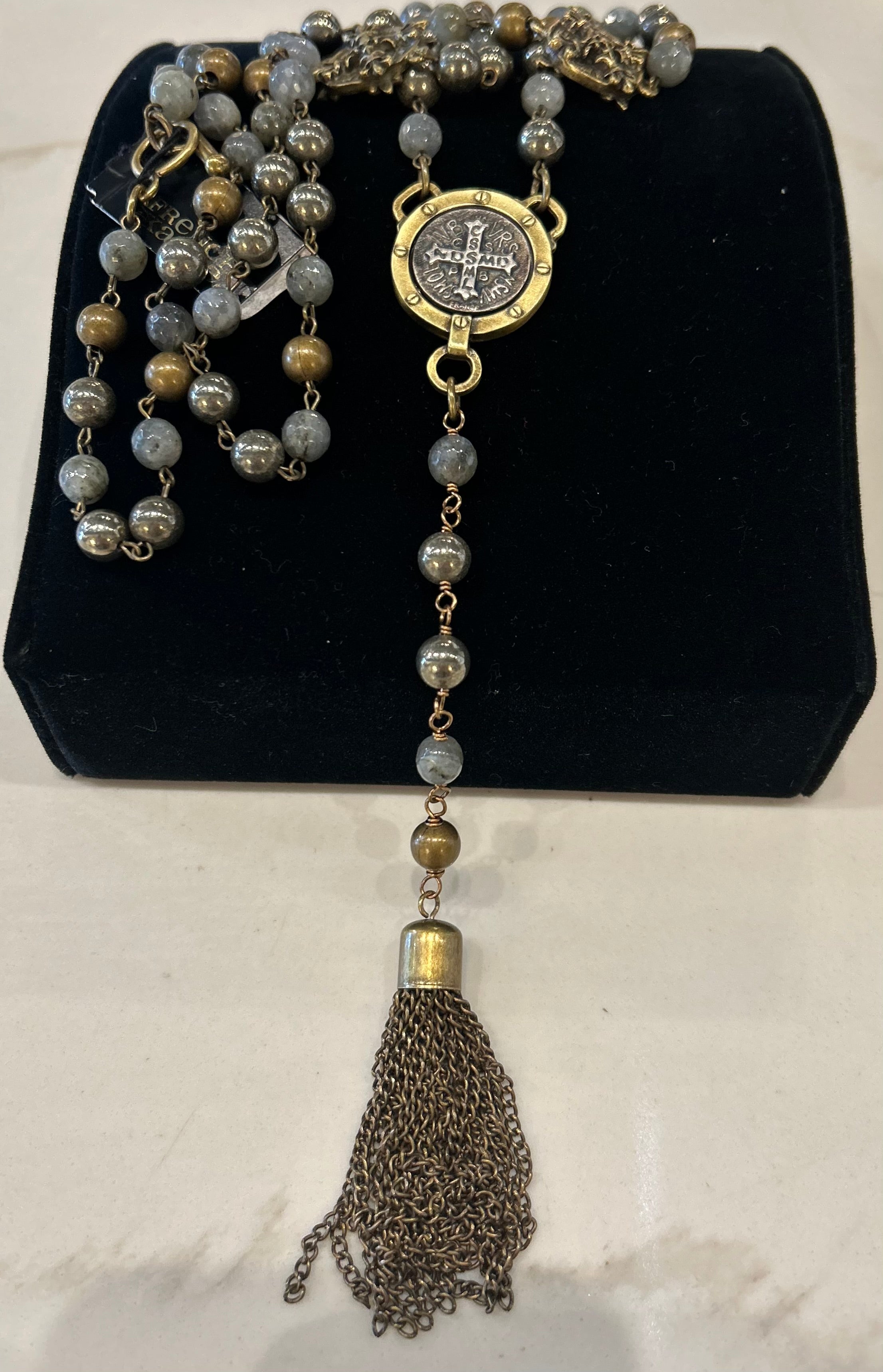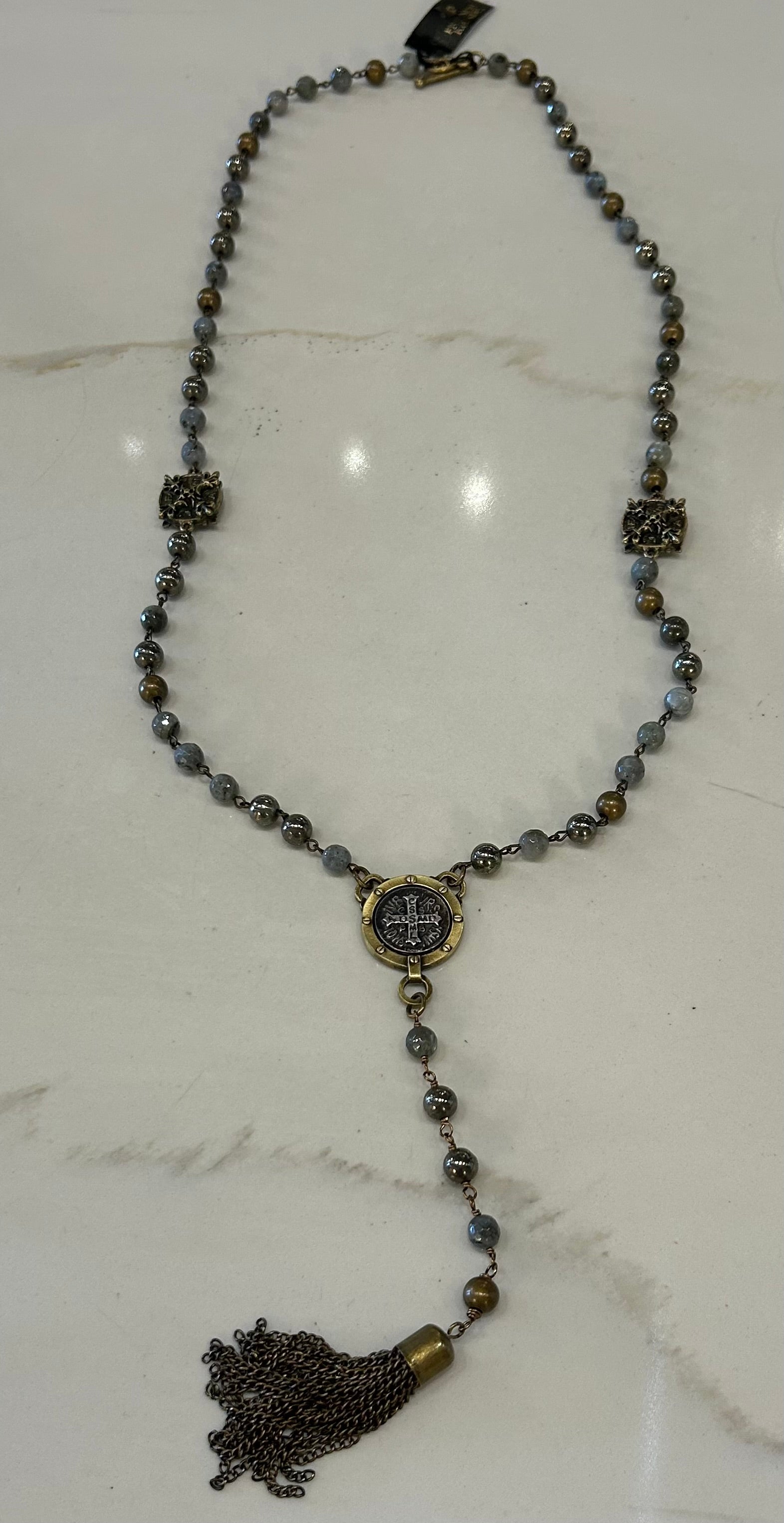 35” necklace with tassel hanging an additional 5.5”