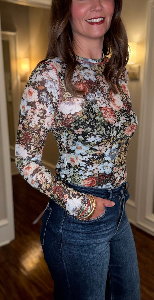 FLORAL SHEER SLEEVE HENLEY 7.23