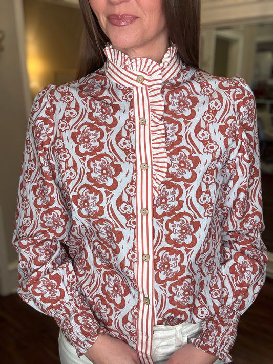 LOVE SOFT RUST FLORAL STRIPED TRIM TOP 1.27