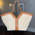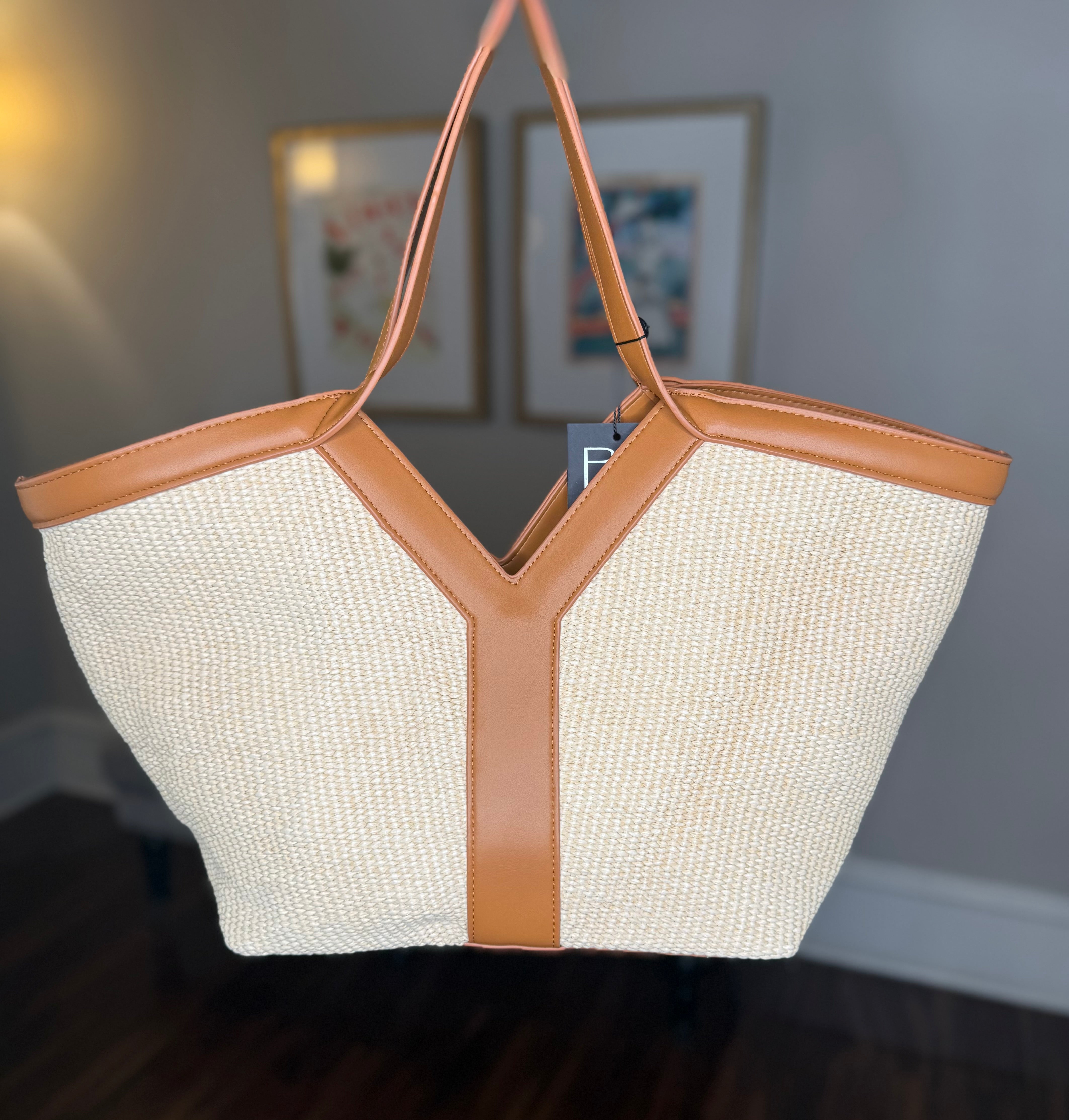 Woven straw fabric with leather contrast trim