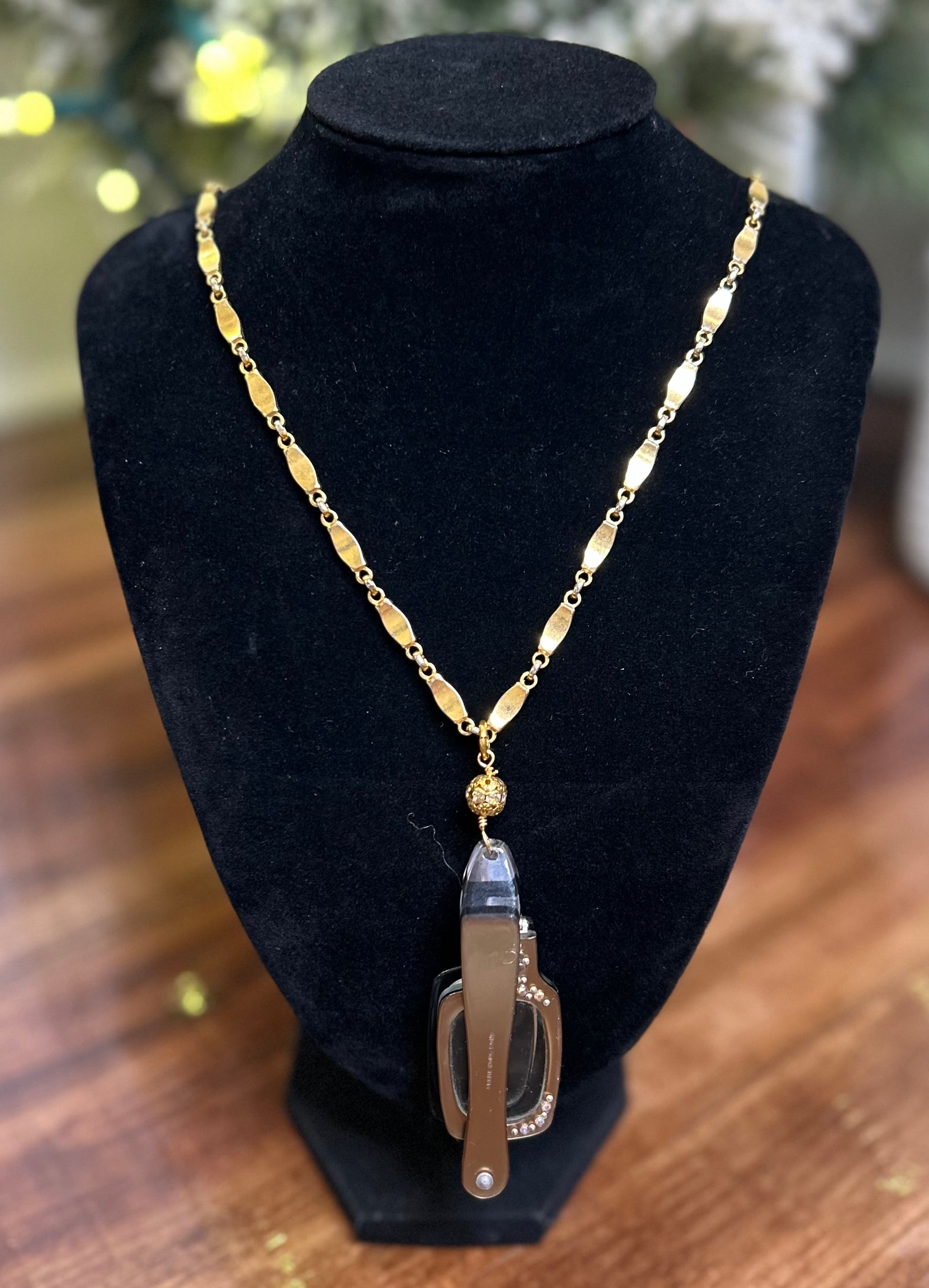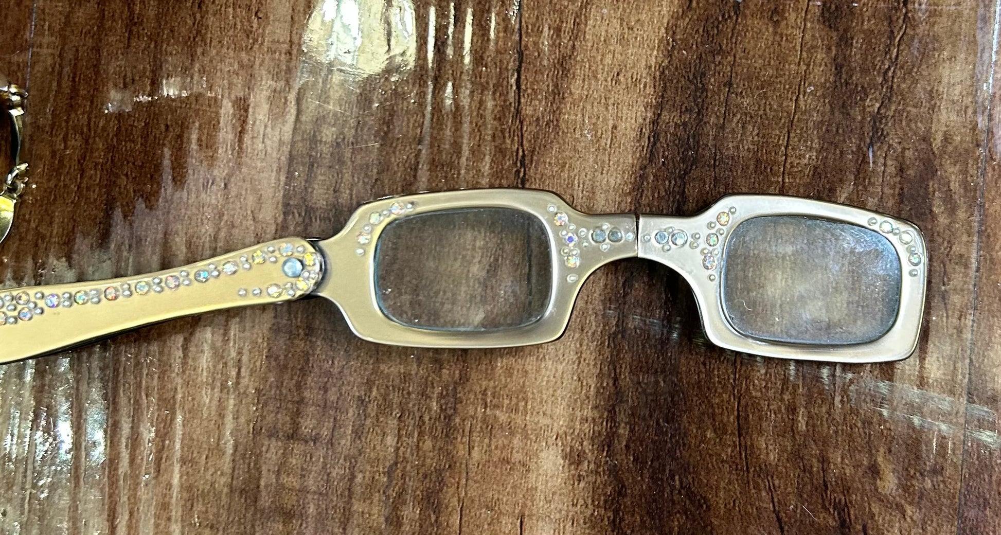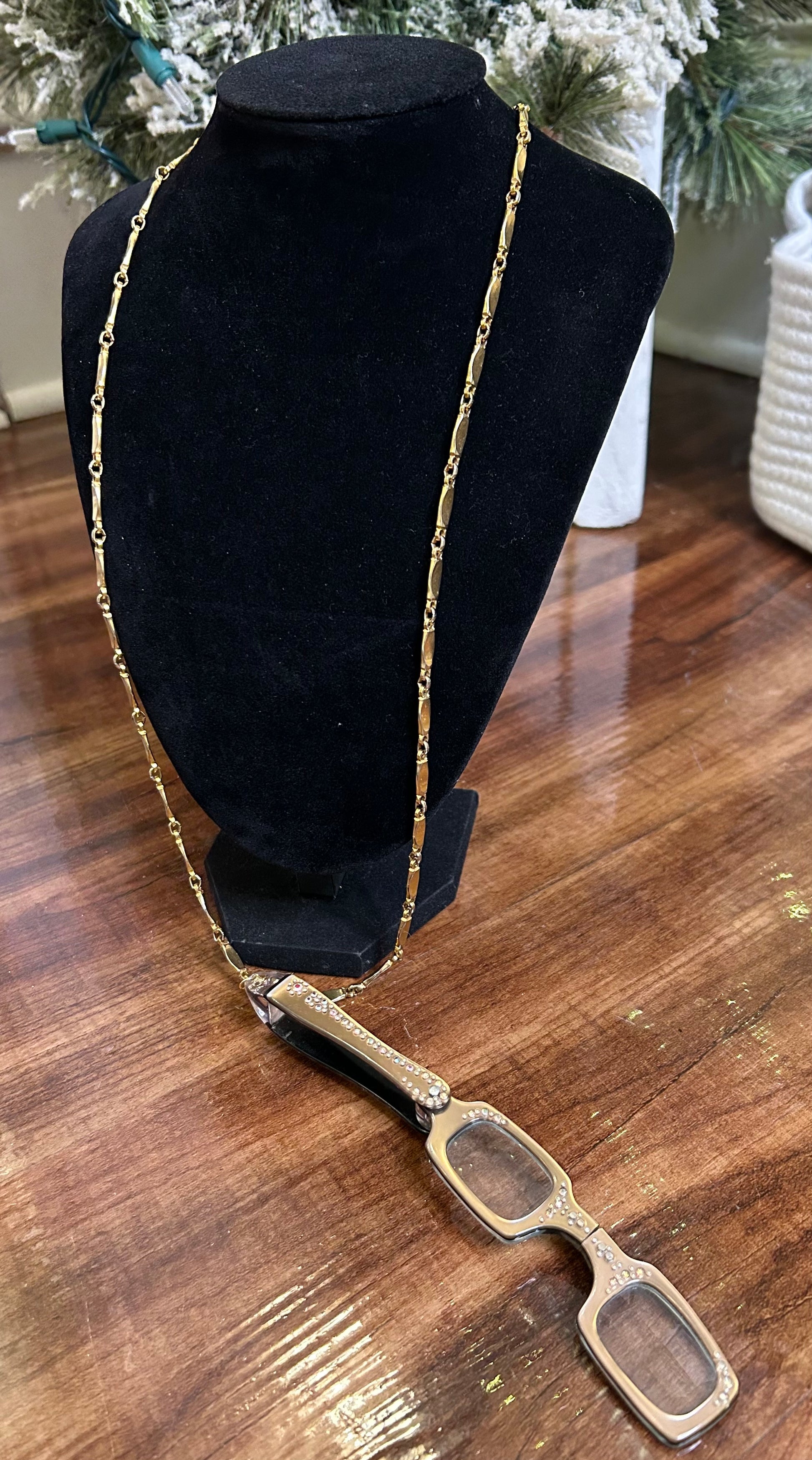 Vintage rhinestone reading glasses on golden chain