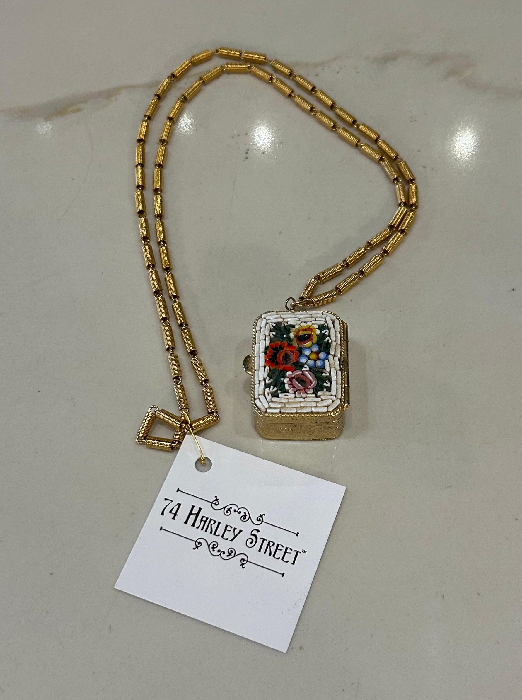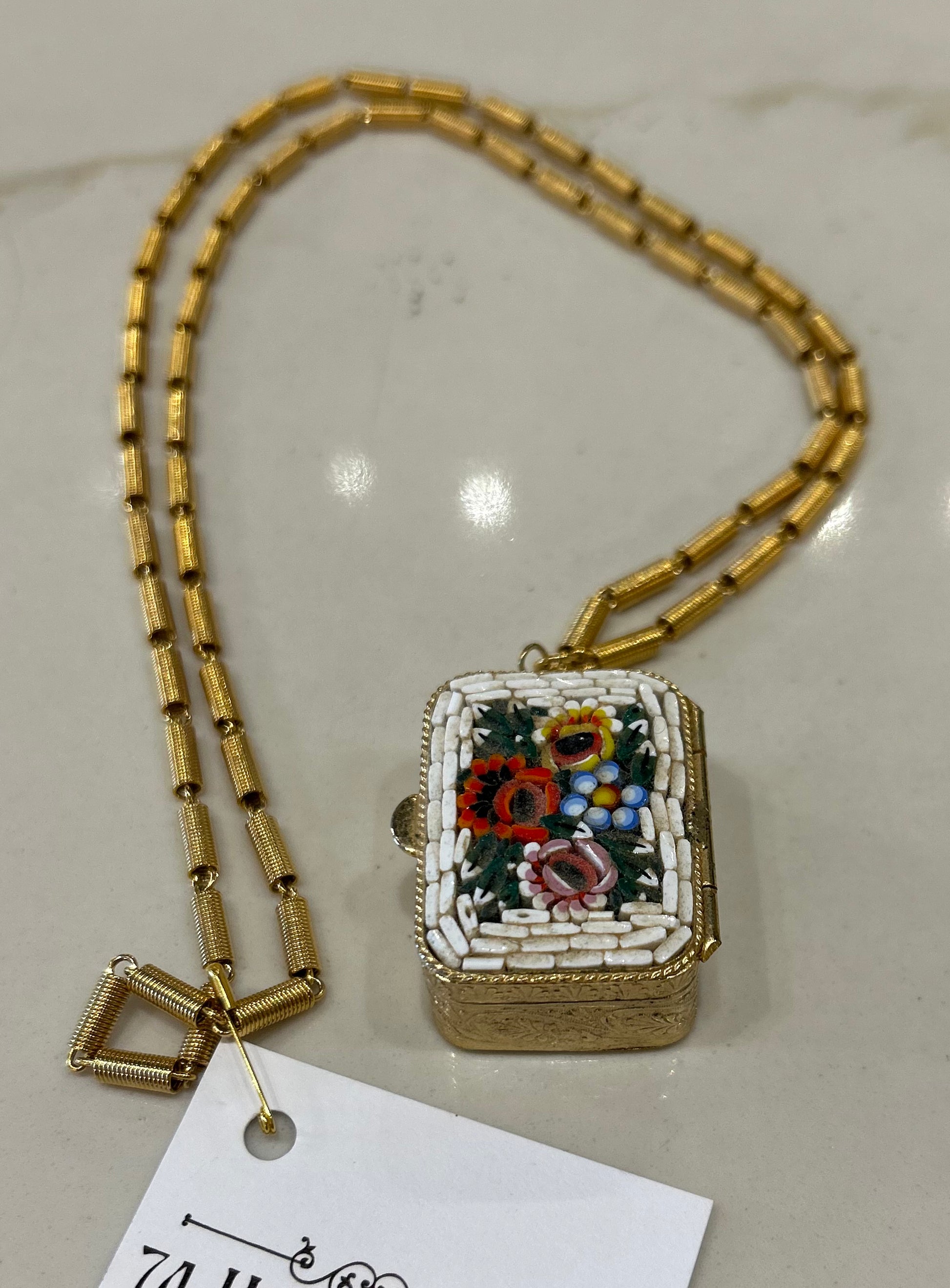 Vintage Italian mosaic pill box on golden coil chain