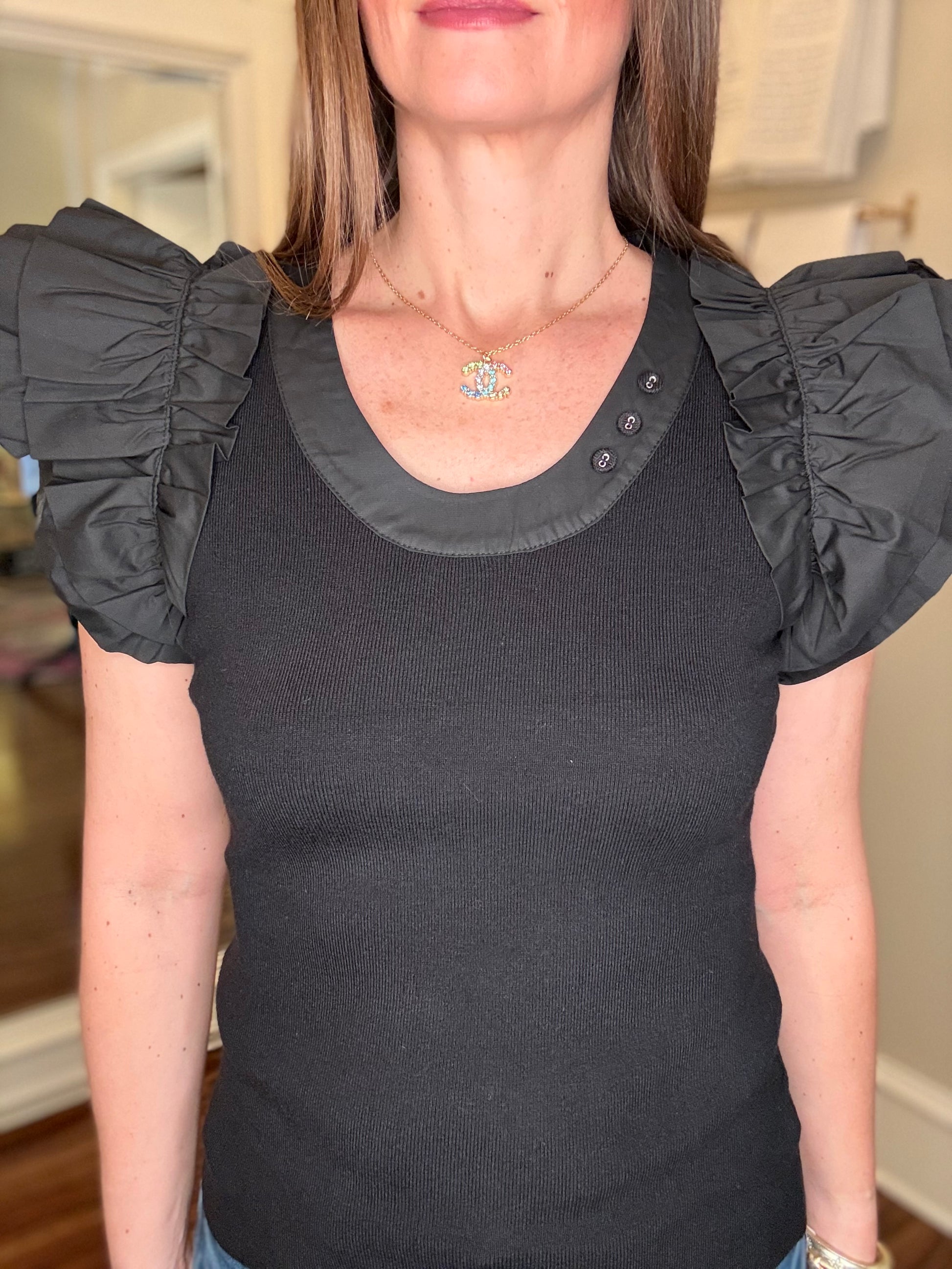 Ruffled shoulder and trim are poplin cotton and body is a lightweight sweater fabric
