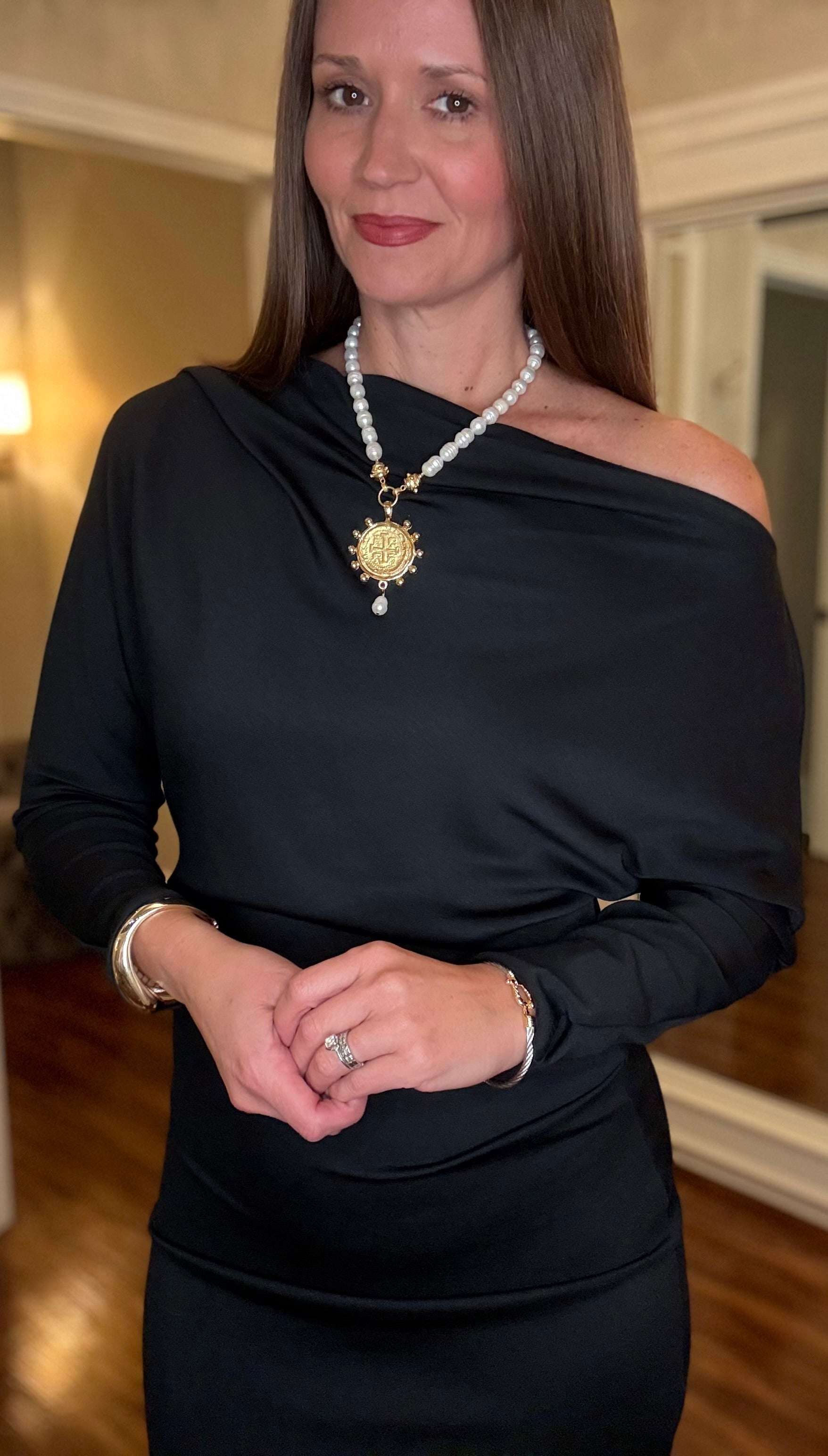 Draped neckline can be worn off one shoulder or both